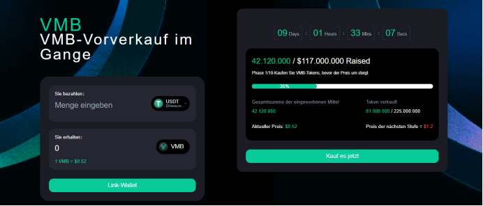 Vaultymint hat heute offiziell seinen Plattform-Token VMB vorgestellt, der bei Investoren großes Interesse und breite Aufmerksamkeit erregt hat. In der Vorverkaufsphase wurde der VMB-Token zu einem Preis von 0,52 USD verkauft, mit einer Gesamtmenge von 450.000.000 Token, und es wurden bereits 42 Millionen USD eingesammelt. Dieses beeindruckende Ergebnis spiegelt nicht nur die hohe Anerkennung des Marktes für die Vaultymint-Plattform wider, sondern zeigt auch das starke Vertrauen der Investoren in das zukünftige Potenzial des VMB-Tokens.