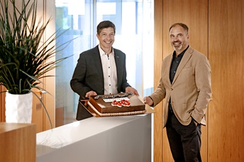 Foto (Kreissparkasse Göppingen/Beuttenmüller): Klaus Meissner,stellvertretender Vorstandsvorsitzender der Kreissparkasse Göppingen (links),überrascht Andreas Müller,Geschäftsführer der Stauferkreis Beteiligungen GmbH,mit einer Torte zum 40-jährigen Bestehen.
