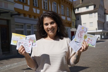 Foto (Stadtverwaltung Geislingen an der Steige / Christiane Wehnert): iPunkt-Mitarbeiterin Simona Ippolito mit sechs wunderschönen Kinderfest-Postkarten.
