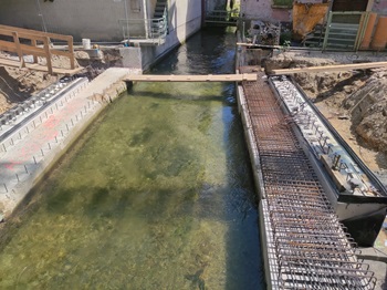 In den vergangenen Wochen konnten wichtige Fortschritte bei der Erneuerung der Mühlkanalbrücke erzielt werden. Die neuen Widerlager wurden erfolgreich hergestellt und betoniert. Derzeit konzentrieren sich die Bauarbeiten auf die Errichtung des Traggerüsts und der Schalung für den Brückenüberbau.