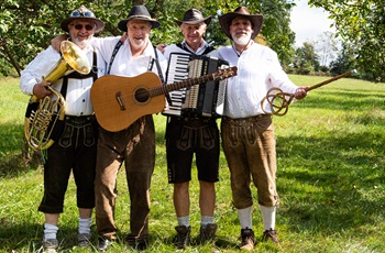 Ein musikalisches Highlight des Abends ist Simon Wild. Mit seiner Steirischen Harmonika und Hits wie „Immer wieder im Sommer“ sorgt er für echte Volksfeststimmung. Seine Mischung aus eigenen und bekannten Titeln begeistert weit über die Region hinaus – von Stadtfesten bis Après-Ski-Events. Auch in Waldhausen wird er das Publikum garantiert mitreißen. Zum ersten Mal dabei sind die Goissroiner (Foto),die Fun- und Partyband. Goissroiner,hochdeutsch: die vier Musiker aus dem Gaisrain,geben mit ihren Instrumenten