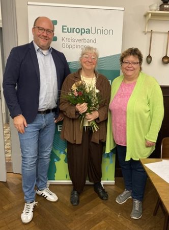Neben den Wahlen stand auch die Ehrung verdienter Mitglieder auf der Tagesordnung. Dabei wurde mit Brigitte Mauch (Göppingen) ein Mitglied geehrt,das seit 30 Jahren dem Verband angehört und die Europa-Union auf ihre Art geprägt hat. Die Jubilarin erhielt eine Anerkennung des Kreisverbandes.