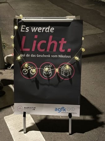 Die erfolgreiche Nikolaus-Aktion der AGFK-BW steht wieder vor der Tür. Auch in diesem Jahr ist der Nikolaus im Landkreis Göppingen unterwegs und belohnt Radfahrende und erstmals auch Zufußgehende. Die beliebte Nikolaus-Aktion macht mit Schokoherzen und Fruchtgummis auf die Bedeutung der Sichtbarkeit aktiver Mobilität,gerade auch in der dunklen Jahreszeit,aufmerksam und möchte zu einem freundlichen Miteinander im Straßenverkehr beitragen.