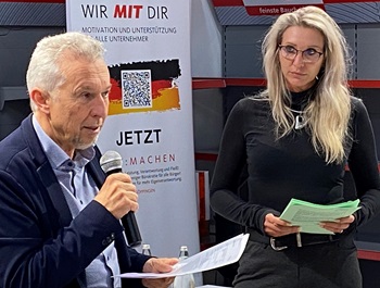 Foto:  Wolfgang Amann (l.) und Susanne Gminder vom Arbeitskreis kommunal der Mittelstandsunion (MIT) informieren rund 50 interessierte Unternehmer aus dem Landkreis über die aktuelle Diskussion zur Nachnutzung der Klinik am Eichert. Foto: MIT/Rüdiger Gramsch