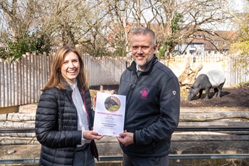 Ende Februar 2025 bekam der Zoologisch-Botanische Garten Stuttgart Besuch aus dem Rheinland. Nadine Grund,die Inhaberin des in Düsseldorf ansässigen Unternehmens Grund Coaching war eigens angereist,um ihren neuen Patentieren zu begegnen: Nämlich den Schabrackentapiren in der Wilhelma. Direkt vor der Anlage der südostasiatischen Tierart nahm Nadine Grund ihre Patenschaftsurkunde von Volker Grün,einem der beiden stellvertretenden Direktoren der Wilhelma,persönlich in Empfang.