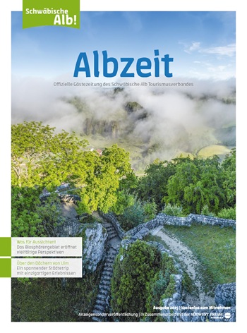 Die Gästezeitung „Albzeit“ 2025 ist ab sofort kostenlos erhältlich. Interessierte können die Gästezeitung online unter www.schwaebischealb.de/prospekte per Post nach Hause bestellen,digital herunterladen oder direkt auf der Webseite lesen. Zudem liegt die „Albzeit“ in vielen Tourist-Informationen der Region zur kostenfreien Mitnahme aus.