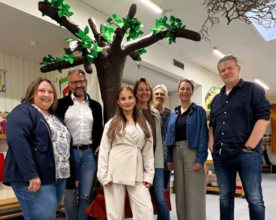 Foto (Stadt Uhingen): Freude über die besonderen beruflichen Möglichkeiten bei der Stadt Uhingen (von links): Katja Eisenmann (Kindergartenleitung),Bürgermeister Matthias Wittlinger,die neue Mitarbeiterin Nazar Yilmaz,Gruppenleiterin Petra Fitz,Fachbereichsleiterin Anette Epping sowie Sina Scheel und Thomas Neumeister vom Sozialdienst „Arbeit vor Ort“ der Lebenshilfe