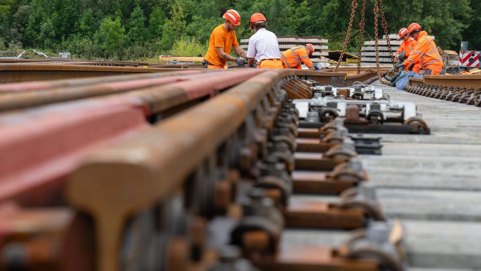 Arbeiter bereiten in Brandenburg eine fertig montierte Weiche für den Ausbau der Strecke Hamburg–Berlin vor