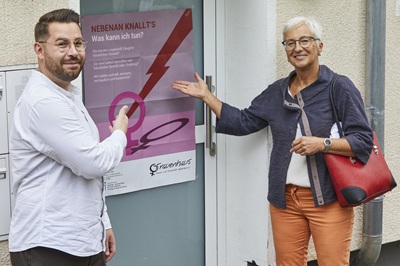 Anlässlich des Starts der Kampagne enthüllten Beate Simon,Leiterin des Göppinger Frauenhauses und Fabian Schütz,Regionalleiter Stuttgart Umland bei Vonovia,ein Plakat,das Vonovia in den nächsten Tagen in allen Treppenhäusern des Wohnungsunternehmens in Göppingen aushängen wird. Zusätzlich werden alle