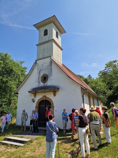 Bei der Exkursionsreihe „Kapellen und Kleinode im Landkreis Göppingen“ war am Samstag,5.7.2025,die St. Georg Kapelle in Unterweckerstell das Ziel – und von Schaudern zunächst keine Spur. Vom Wanderparkplatz nahe der „Waldschenke Donzdorf“ ging der Weg vorbei am Schmelzofen,wo tatsächlich ehemals Eisen gewonnen wurde,und zum Rückhaltebecken,dem Stausee von Donzdorf,der seither die alljährlichen Hochwasser für die Stadt Donzdorf bannt.