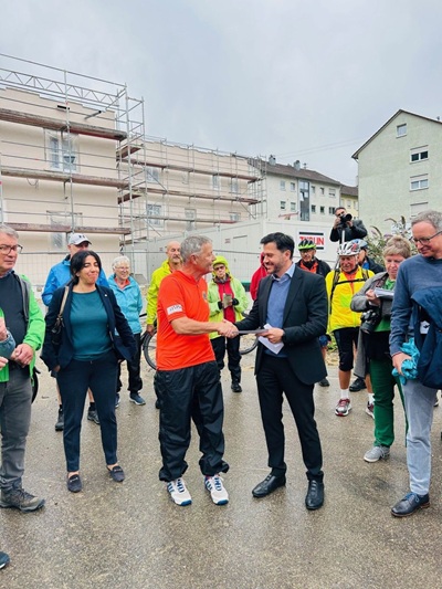 Mit dabei: der Initiator und ehemalige Bundestagsabgeordnete Klaus Riegert sowie zahlreiche engagierte Radlerinnen und Radler,die sich für den guten Zweck in den Sattel schwangen. Empfangen wurde die Gruppe am Mittwoch,30. Juli 2025,unter anderem von Oberbürgermeister Ignazio Ceffalia,der die Gelegenheit nutzte,einen Spendenscheck in Höhe von 100 Euro im Namen der Stadtverwaltung zu überreichen. Die Spende kommt dem Verein Hospiz im Landkreis Göppingen e.V. zugute – insbesondere zur Unterstützung des geplanten Hospizes in unserer Stadt.