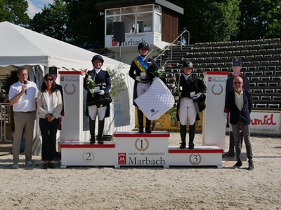 Zum Auftakt des heutigen Turniertages setzten sich die erfahrenen Amateurreiterinnen mit ihren Sportpartnern eindrucksvoll in Szene. Den Sieg sicherte sich Josephine Burger vom RV St. Hubertus Villingen auf dem 10-jährigen Oldenburgerhengst Vom Feinsten OLD,der gleichmäßig hohe Noten erhielt und mit 69,921 % an die Spitze galoppierte. Knapp dahinter platzierte sich Sophia Scheld (TG LLZ Ansbach e.V.) mit ihrer DSP-Stute Donna Noble,die mit ausdrucksvoller Trabtour überzeugte und auf 69,048 % kam. Rang drei ging an Vanessa Prietz (RG Kleinkuchen) mit dem Quaterback-Sohn Quentin,der sich besonders in den Galopptouren stark präsentierte. In der mittäglichen Kids-Cup-Prüfung zeigten die Nachwuchsreiter ihr Können. Die goldene Schleife ging an Martha Louisa Temme (TG Stall Buchenhof e.V.) mit der Oldenburgerstute Faynoon,die mit feiner Anlehnung und harmonischem Gesamteindruck ein Top-Endergebnis von 76,292 % erzielte. Platz zwei erreichte Franka Müller (RC Badhof-Bad Boll) mit dem Westfalen Fürst Flynnigen W,der geschmeidige Übergänge und eine sehr gute Losgelassenheit zeigte (72,658 %). Über Rang drei freute sich Eleonore Luidthardt (RV Bietigheim-Bissingen) mit dem DWB-Wallach Shakespeare Fly. In der schweren Tour überzeugte Nicole Casper (RV Gestüt Birkhof) mit ihrem 9-jährigen DSP-Wallach Zabalou 3 auf ganzer Linie. Mit konstant hohen Noten in allen Grundgangarten siegte das Paar mit 71,500 %. Frederik Leon Steisslinger (RFV Böblingen) pilotierte den routinierten Favory A.S. auf Platz zwei (68,947 %),gefolgt von Natalie Gauß-Ernst (RV Lautertal) mit Fine Emotion,die eine ausdrucksstarke und sichere Runde zeigte. Bereits zum zehnten Mal war Marbach Austragungsort dieses besonderen Championats,das ausschließlich geprüften Pferdewirten und Pferdewirtschaftsmeistern offensteht. Der Modus des Pferdewechsels,bei dem alle Teilnehmer innerhalb von fünf Minuten auch die Pferde ihrer Mitbewerber vorstellen müssen,erlaubt einen objektiven Vergleich des reiterlichen Könnens. In diesem Jahr sicherte sich Jana Vath (PZV Tauber-Franken) mit Di Dörte,Ben und Sir Admiral from Scheider den Titel (67,961 %). Silber ging an Beate Siegle (RV Ditzingen) vor Christiane Bader (RV Ilsfeld),die sich den Bronzerang holte. Die gezeigten Leistungen unterstrichen erneut die sportliche Qualität und Traditionsbedeutung dieses Wettbewerbs. In der abschließenden Pony-Dressurprüfung „in memorian an Heinz Bürk“ des Tages setzte sich Maya Victoria Irene Wächter (RV Waldenbuch Hasenhof e.V.) mit dem erst 8-jährigen Melli’s Glückskeks erneut an die Spitze. Mit 72,114 % überzeugten die beiden durch präzise Lektionen und einen gleichmäßigen Fluss. Auf Platz zwei folgte Stella-Sofie Mankowski (RV Kehl-Sundheim e.V.) mit Goldwyn,während sich Nina Bäuerle (RC Badhof-Bad Boll) mit der Ponystute Die Zaubermaus NRW den dritten Rang sicherte. Mit dieser Prüfung endete die Qualifikationsrunde – das Finale des Pony-Dressur-Masters findet vom 18. bis 21. September 2025 im Rahmen des CHI Donaueschingen statt.