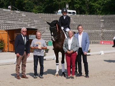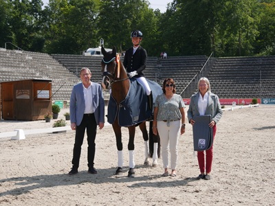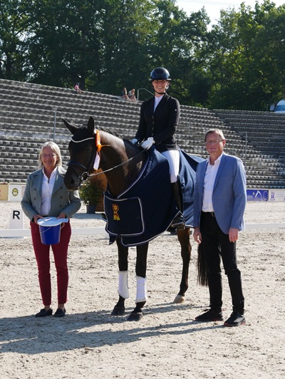 mit dem vierjährigen DSP Gut Wettlkam’s Bali an die Spitze. Das Paar überzeugte vor allem in der Durchlässigkeit und im Gesamteindruck und siegte mit der Endnote 8,54. Auf Rang zwei ritt Jasmin Schaudt (RFV Herbertingen) mit Jamie Oliver (8,26),dicht gefolgt von Julia Kühn (PSV Heidelberg-Ladenburg e.V.) auf Florine 24,die den dritten Platz belegte.