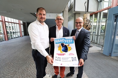 Foto (Constantin Fetzer): Alexander Bremora (Geschäftsführer der Kreishandwerkerschaft Göppingen),Kreishandwerksmeister Jürgen Schmid und der Schulleiter der Gewerblichen Schule Göppingen,Jürgen Wittlinger (von links),freuen sich auf das Hand-Fest.