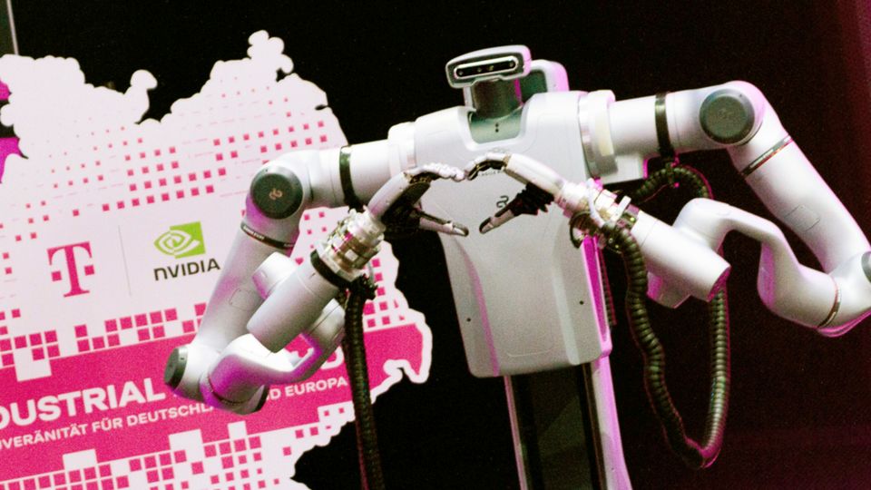 Roboter bei der Vorstellung eines neuen KI-Zentrums von Deutscher Telekom und dem Chiphersteller Nvidia