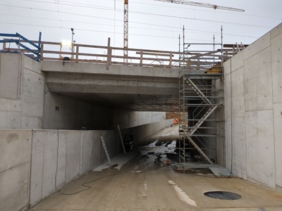 Die insgesamt neun Blöcke der neuen Bahnunterführung sind fertig betoniert. Bis auf kleinere Betonarbeiten ist damit die Betonage der Mühlbachtrasse abgeschlossen. Bei der gemeinsamen Baumaßnahme von Stadt und Deutscher Bahn geht es nach der Winterpause in den Endspurt,sodass die neue Verkehrsverbindung im Sommer eröffnet werden kann.