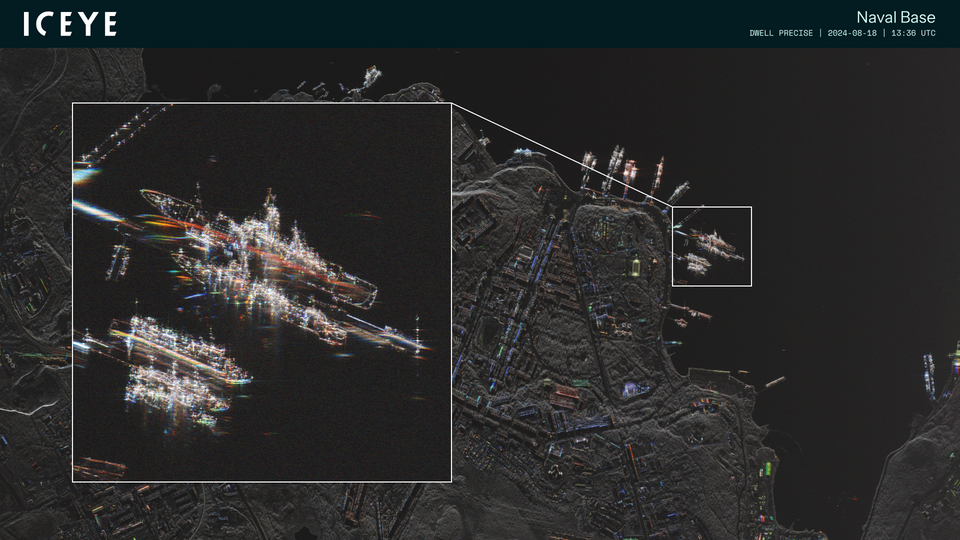 Radarsatellitenbild einer Marinebasis: Durch die Dunkelheit und die sonst oft störenden Wolken blicken