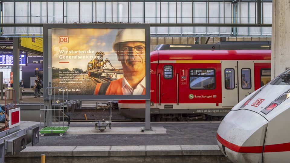 Die Deutsche Bahn kündigt auf einem Plakat die Generalsanierung an