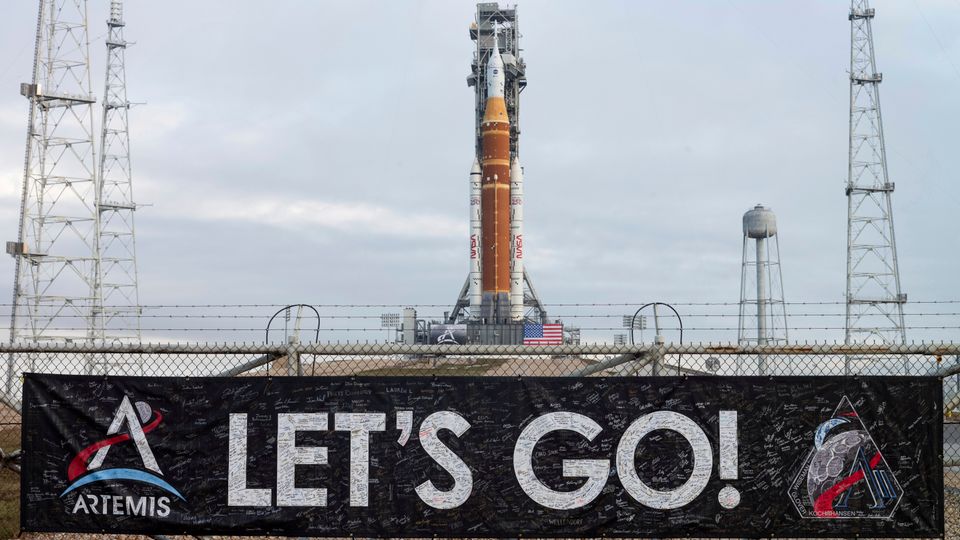 Das Raketensystem für »Artemis 2« steht startbereit da