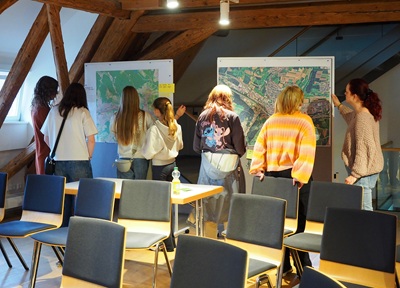 Diese pinnten die Jugendlichen an eine Stellwand,auf anderen waren Stadtpläne befestigt,an denen die Jugendlichen mit Pinnnadeln zeigen konnten,wo sie sich am häufigsten aufhalten: im Umfeld des Jugendhauses,bei den Schulen,am Skatepark sowie der Legal Wall und an Spiel- und Sportplätzen. Ergänzt wurden die Karten durch Zettel,auf denen Wünsche für den jeweiligen Standort geäußert wurden: eine Schaukel am Spielplatz Stuttgarter Straße oder eben eine Kletterwand beim Skatepark.