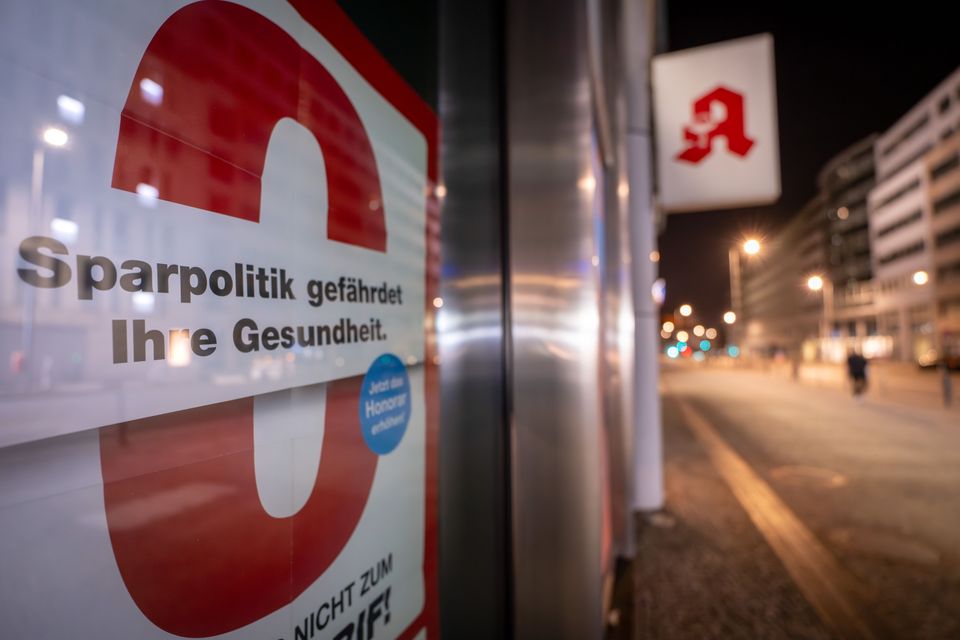Protestbanner in einer Apotheke in Berlin: Notdienst bleibt gewährleistet