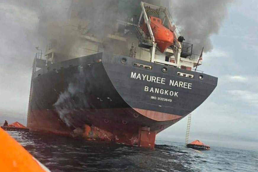 Brennendes Frachtschiff »Mayuree Naree« am 11. März in der Straße von Hormus: Transport stark verteuert